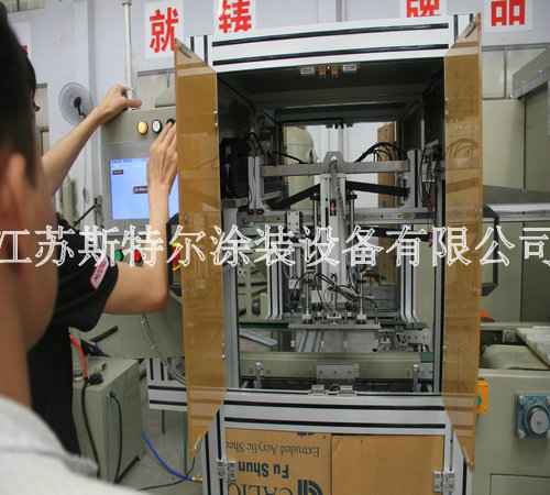 全自動玻璃水砂自動噴砂機由自動上料機、自動噴砂機和自動下料機三大部分組成:首先由自動上料機將附有兩組Tray盤Port可自動交換,需人工放Tray盤至LD Port, Tray盤定位后,移栽Arm開始取片,玻璃整列,再由移栽Arm直接將玻璃放置在載具Stg上,送入噴砂設備,當一個Tray port 取完后,會報警提醒人員裝載新的Tray盤,當空Tray盤滿杯后設備會自動報警通知人員取走空Tray盤,以此循環動作.然后到全自動玻璃水砂自動噴砂機,由人工自行調配一定的水砂比例后設備自動進行混合攪拌,自動上料機構抓取玻璃放到輸送同步帶上,進入噴砂機腔體進行噴砂,噴砂作業結束后,進入水刀處進行噴淋,噴淋結束后由風刀進行吹干。吹干后移動至下料機移栽位置,由移栽將玻璃抓取至下料機FORK上,以此循環。噴砂、清洗、吹干區域有擋邊防止工件位移。最后自動下料機將附有兩組CST Port可自動交換,需人工放空的CST至UnLD Port, CST翻轉90°后,氣缸機械定位,由移栽arm從治具上取玻璃放置Fork上,送入CST, CST Port內的基板利用Fork方式由最高層開始放片,Fork 真空感知Sensor/玻璃光纖sensor OFF后,Fork自動退回到等待位置,以此循環。當CST裝滿后,設備會報警提示人員將CST取走并裝入空的CST。